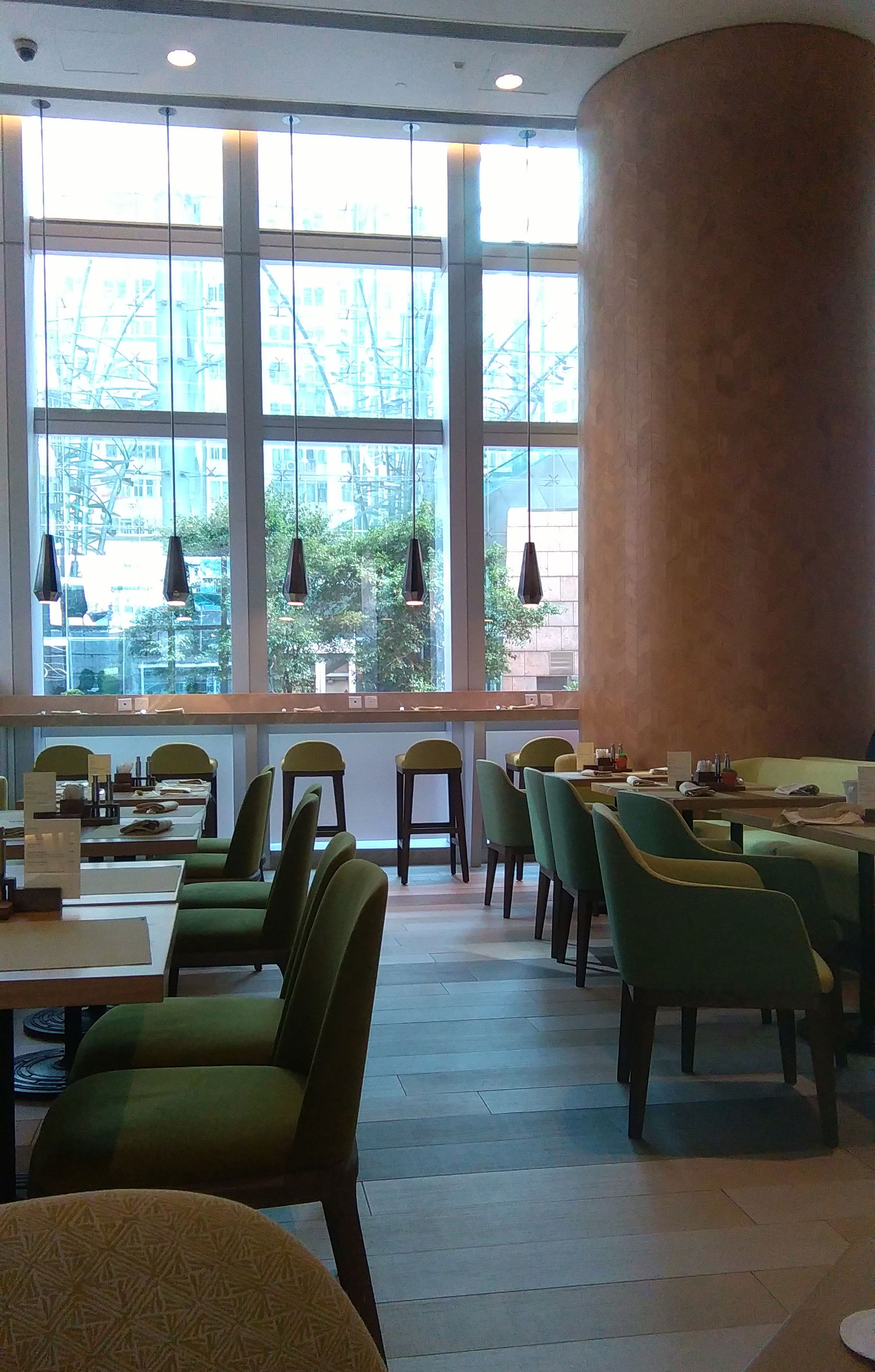 The whole room was beautiful and aside from the spectacular view, you couldn’t fault any of the more normal ‘hotel’ aspects; the place was spotless, everything was in great condition and in spite of the huge wrap-around windows, there were black-out curtains all the way around so no amount of Hong Kong’s sleeplessness could keep us up. There’s also so many very clever features of the Cordis experience that kept us consistently amused; notably, one of my favourites was a mobile phone, ‘the handy’, that you could take with you that provided unlimited free internet/hotspots and free local and international calls.
