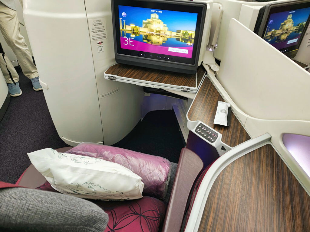 We were both welcomed on board and quickly shown to our respective seats. On the Qatar Airways 787-8’s, the business cabin foregoes the set of centre aisle hand luggage storage bins – so I used the storage over the adjacent window seat, not that storage capacity ever became an issue with the relatively spacious cabin.