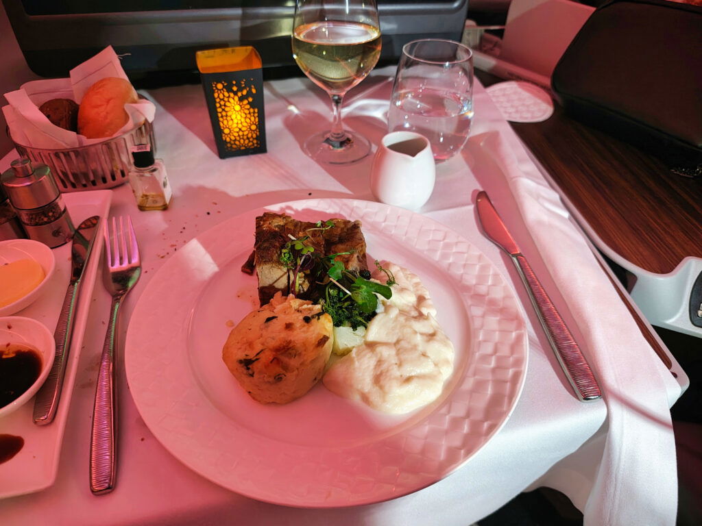 Ultimately, I stuck to the traditional mezze starter, and beef main course – both of which were perfectly fine, although I’d be lying if I didn’t say I was sure I remembered Qatar Airways food being slightly more flavourful.