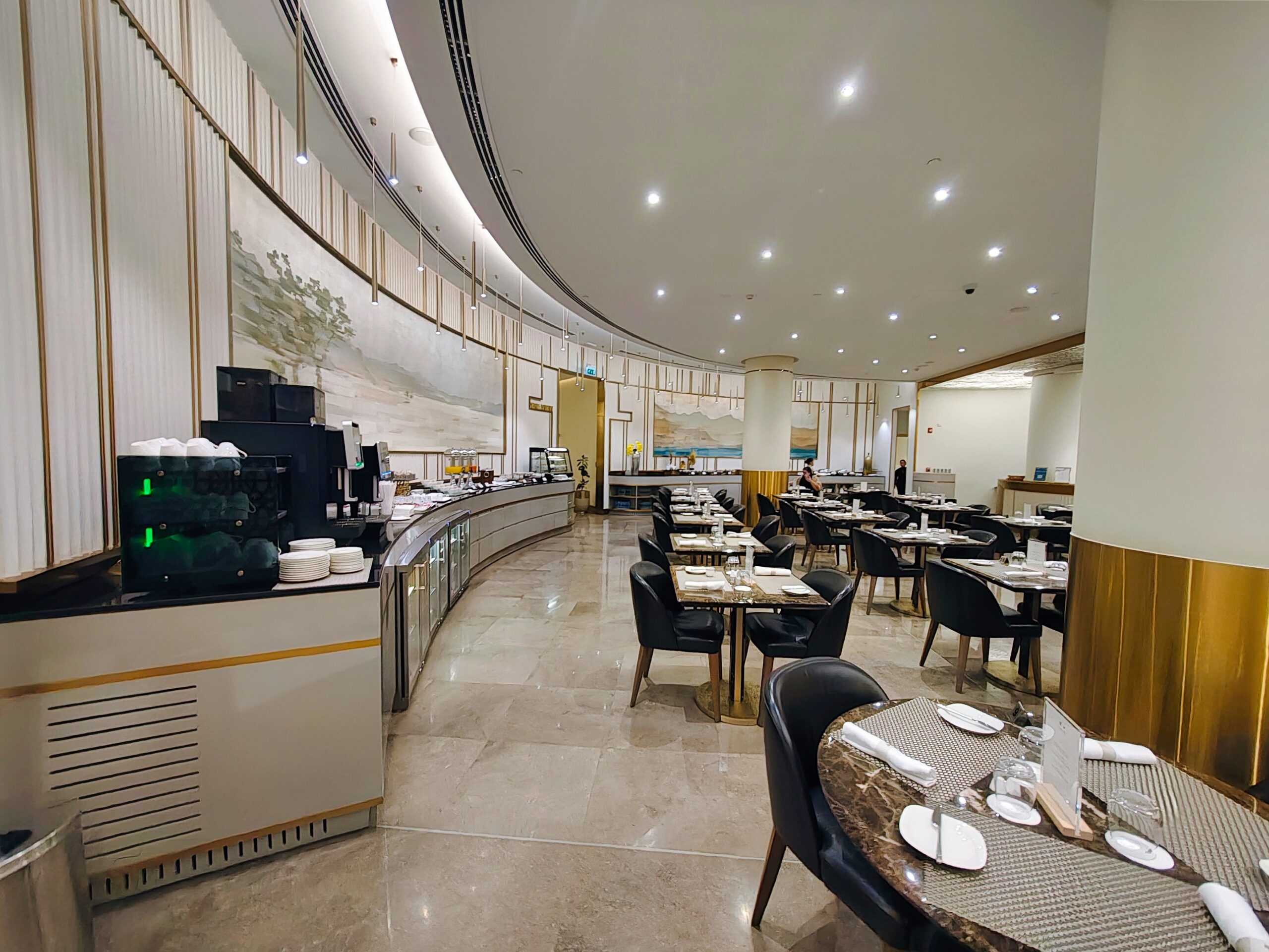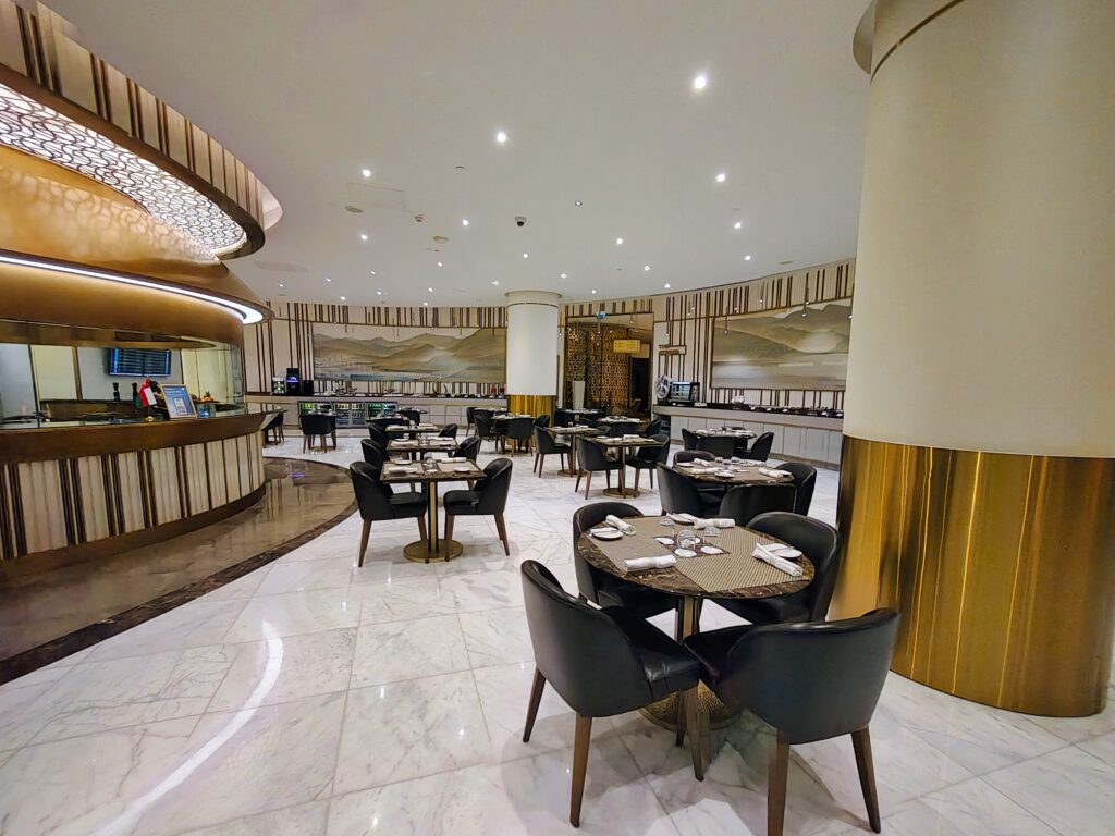 The entrance leads to a meandering corridor lined with armchairs and – at least during our visit – multicoloured lamps, that exude a slightly tacky air, all backed by gold patterened walls behind. Down the meandering corridor and we eventually arrive to the first of two dining areas, where during our visit, late night snacks and eventually, the begining of breakfast was being served.
