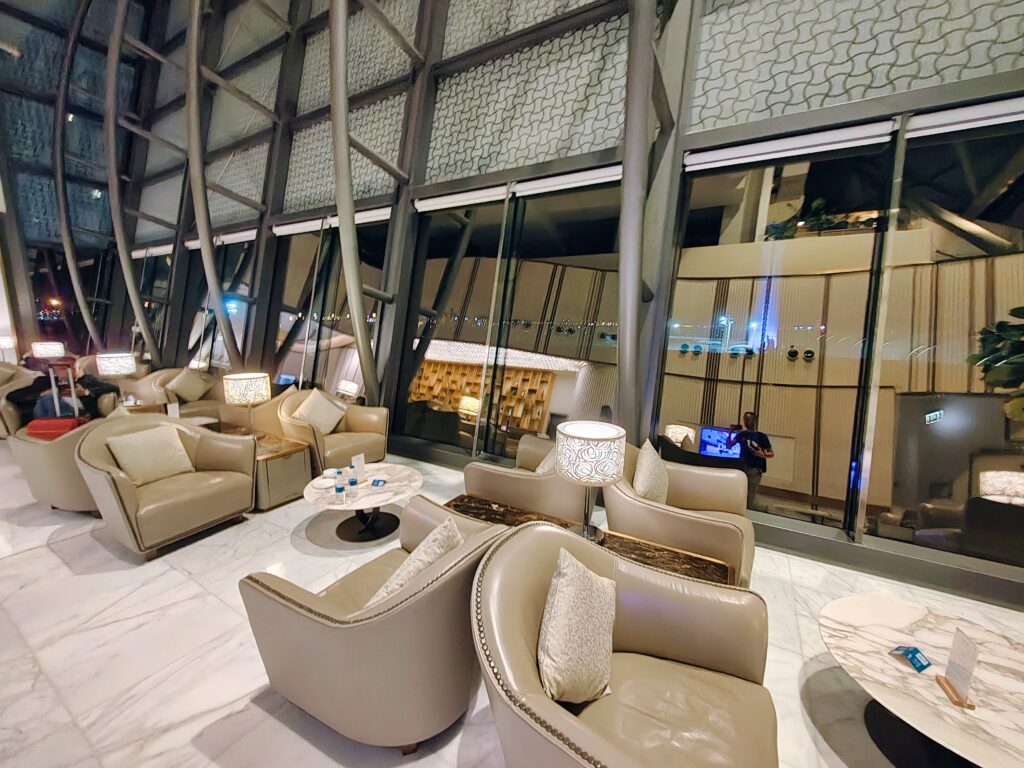 The highlight of the lounge surely has to be the floor-to-ceiling views from the main seating area that runs right down to the other end of the lounge. Facing this area is a large, well-stocked bar.