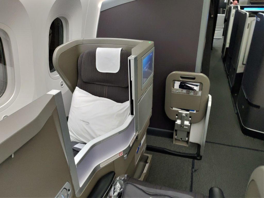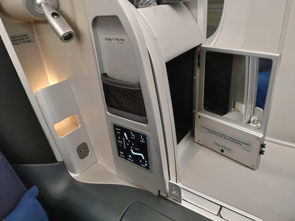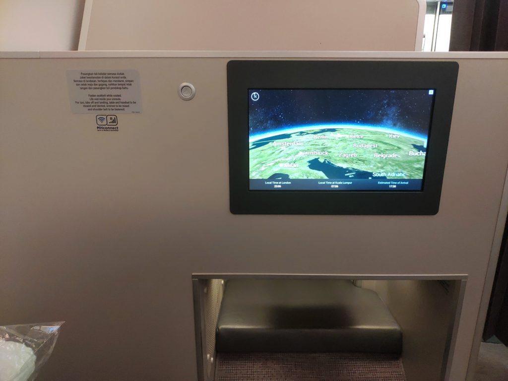 Malaysia Airlines on the other hand, has plenty more space to play with and surely offers more storage, pockets and whatnot at the seat (compared to the tiny drawer at my seat on BA that you wouldn’t manage to fit a handful of pairs of socks into!). But wear and tear (minor scuffs along the seat walls, nicked fabric, etc. – some of which you can see in a picture further down) and a narrow seat despite the space to play with, led me to feel the cabin looked a little less sophisticated and surely, unless you score one of the very few throne seats in the cabin, you will end up feeling quite exposed in the seat as it’s open and visible to everyone. British Airways’ cabin on the other hand has been designed in quite a subtle charcoal grey scheme, which not only looks classy, but seems to also hide scuffs and nicks much better.